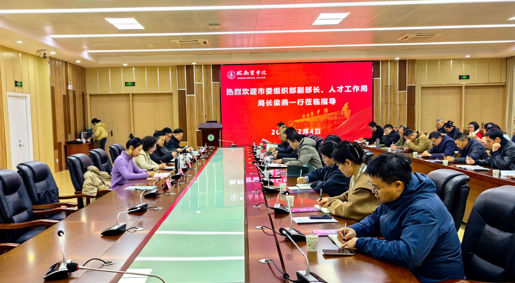 为深入贯彻落实中央及省委、市委关于人才工作的决策部署,深化校地合作,助力学校全面把握芜湖市最新人才、科技、产业政策,2月4日上午,芜湖市委人才局联合市人社局、市科技局、市工信局一行深入我校,在四号实验楼二楼会议室举办专场政策宣讲会。芜湖市委组织部副部长、人才工作局局长梁燕带队,相关部门科室负责人组团宣讲,会议由党委常委、副院长韩永升主持。